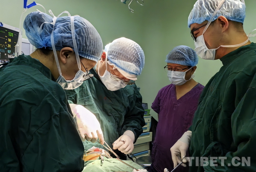 圖為火箭軍特色醫(yī)學(xué)中心口腔科主治醫(yī)師張曉然(左二)與阿壩州人民醫(yī)院口腔科團(tuán)隊(duì)合作,為腭裂患兒實(shí)施腭裂修補(bǔ)手術(shù),阿壩州人民醫(yī)院院長(zhǎng)、主任醫(yī)師楊林(右二)前來觀摩手術(shù)