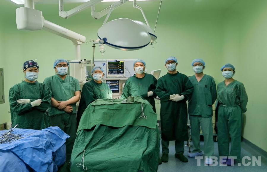 圖為火箭軍特色醫(yī)學(xué)中心口腔科主治醫(yī)師張曉然(左四)與阿壩州人民醫(yī)院口腔科團(tuán)隊(duì)合作為腭裂患兒實(shí)施腭裂修補(bǔ)手術(shù)成功后,手術(shù)團(tuán)隊(duì)在手術(shù)室合影