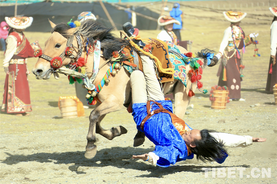 在海拔4000米左右的遼闊天地間,康巴漢子們駕馭著矯健的駿馬、身著華美的傳統(tǒng)服飾,如疾風(fēng)般掠過(guò)金色的草原,在馬背上展示跑馬射箭、乘馬射擊、跑馬拾哈達(dá)、跑馬倒立、跑馬懸體等高難度動(dòng)作,馬蹄聲聲、歡呼陣陣,交織成高原最豪邁的樂(lè)章。(中國(guó)西藏網(wǎng) 記者/畢然 龍真多吉)