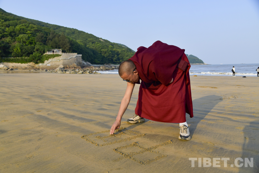 圖為西藏佛學(xué)院學(xué)員在東海岸邊寫下中國二字 攝影:趙振宇