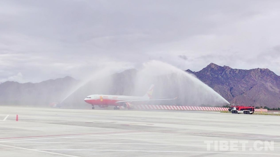 圖為8L9669航班在拉薩貢嘎國際機(jī)場穿過“水門”