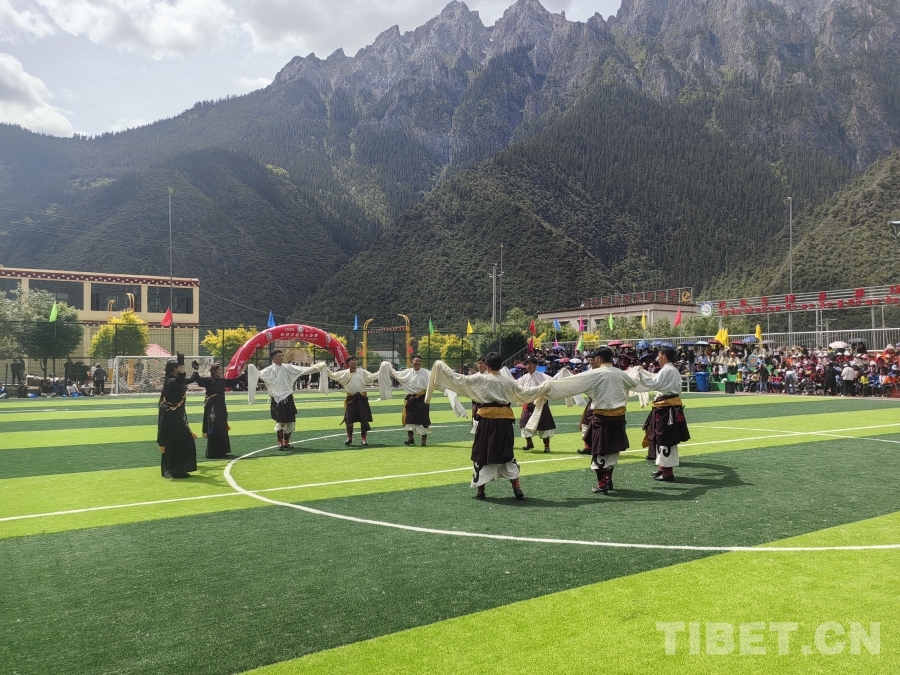 圖為西藏洛隆縣達(dá)龍鄉(xiāng)第二屆中遠(yuǎn)海運鄉(xiāng)村足球聯(lián)賽“吉祥杯”開幕式上的舞蹈表演