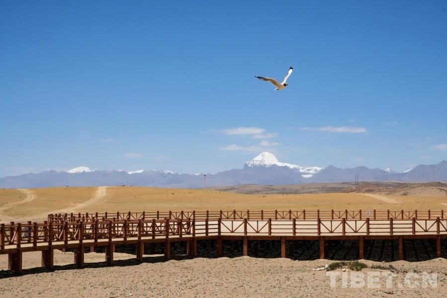 圖為立于瑪旁雍錯旁棧道上的棕頭鷗群,遠(yuǎn)處是岡仁波齊峰 攝影:邊子捷