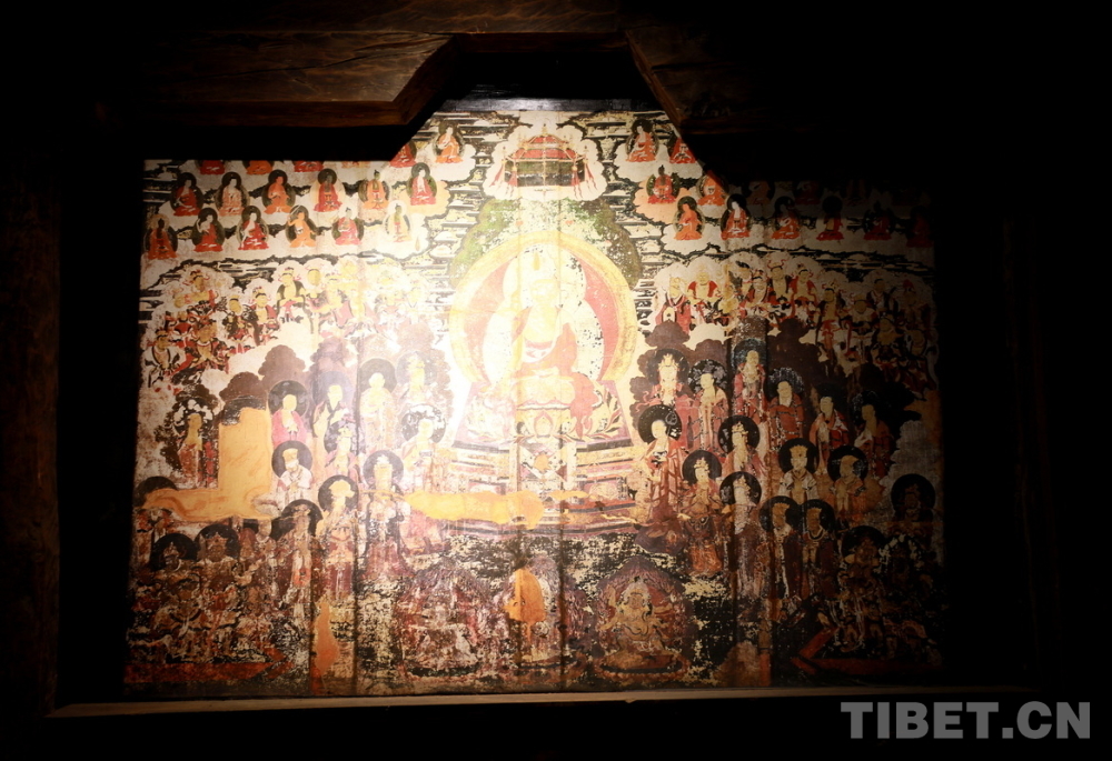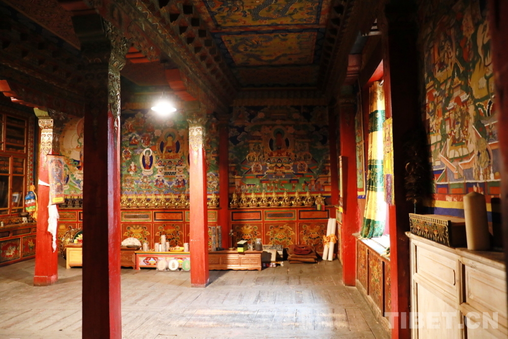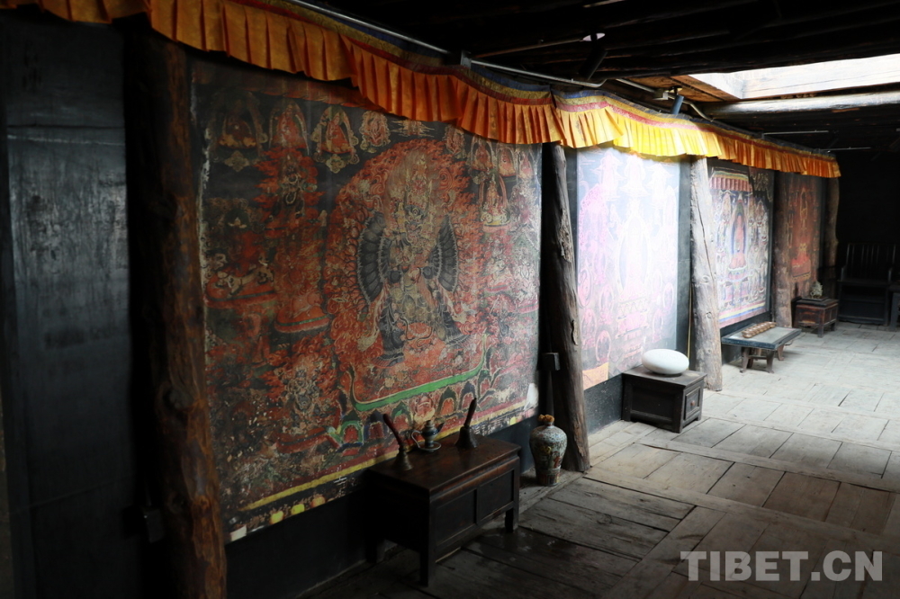 宗薩木府最驚艷的是其經(jīng)堂中歷經(jīng)380余年歷史仍色彩絢麗、保存完整的整堂壁畫。新中國成立后,宗薩木府曾被收歸公有,許多無房的當(dāng)?shù)刎毨罕姳话才抛∵M(jìn)了這里。“文革”時期,宗薩木府的經(jīng)堂被作為村里的倉庫,人們用報紙糊住壁畫,使這些藝術(shù)珍品沒有受到“破四舊”的影響。
