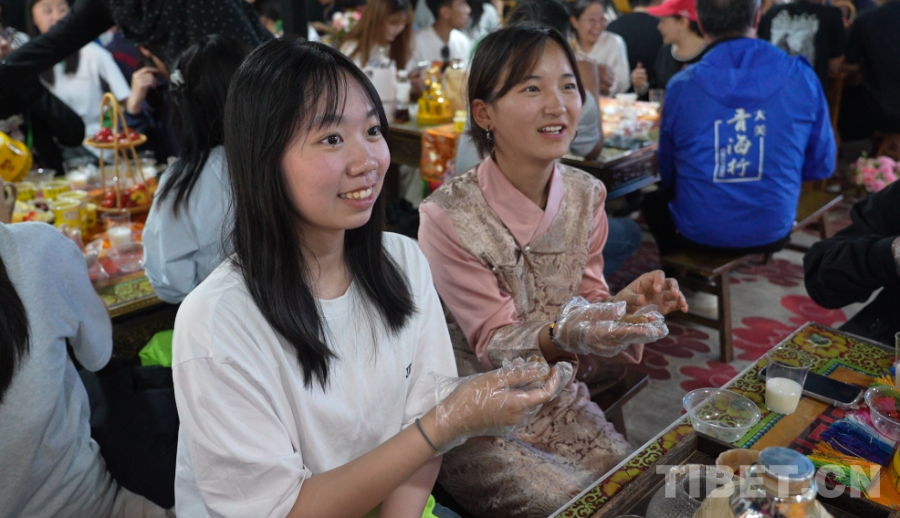 “讓孩子們交朋友、多交流?!边@也是青海省政協(xié)常委、本次研學(xué)團團長吳漢忠最初的想法。在位于海晏縣的文迦牧場的星空下,這場“廣度”之旅迎來溫暖篇章。海北藏族自治州的青少年與香港青少年們圍坐在一起,手把手教香港的朋友制作糌粑,還熱情招呼大家喝奶茶、跳鍋莊,自豪地介紹起自家草原上的牛羊?!棒佤尉褪且檬诌@樣順時針或者逆時針揉搓,最后成團,就能吃啦。還可以蘸一蘸我們的奶茶再吃?!毕愀蹖W(xué)生們也積極回應(yīng)著,相互用“扎西德勒”打著招呼,吃著親手制作的糌粑。有人驚喜發(fā)現(xiàn)“這個糌粑味道好像我家鄉(xiāng)的芝麻糖啊,好香好甜”。