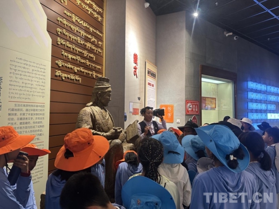 圖為雪豹隊(duì)隊(duì)長(zhǎng)洛桑平措在展廳為營(yíng)員們講解藏文的起源歷史