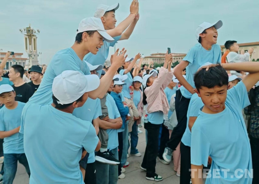 圖為參加“山河同脈·京華筑夢”研學(xué)活動(dòng)的西藏日喀則定日縣中學(xué)生們?cè)谔彀查T廣場 攝影:張?jiān)?/p>