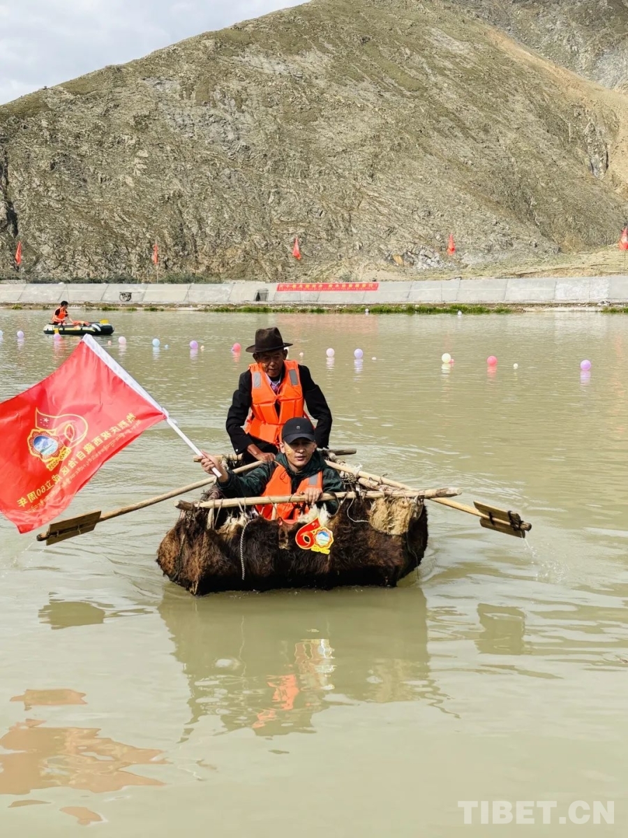圖為南木林縣慶祝西藏自治區(qū)成立60周年文藝匯演中劃牛皮船項目