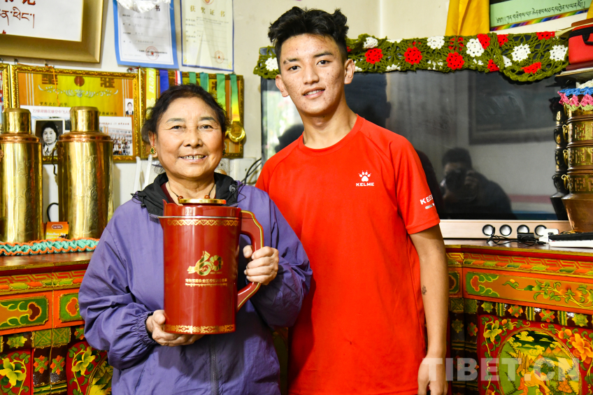圖為羅布次仁為母親卓嘎倒上第一杯酥油茶,這對茶杯是西藏自治區(qū)成立50周年中央代表團(tuán)贈(zèng)送的禮物 攝影:趙振宇