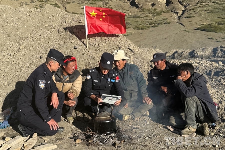 圖為日喀則邊境管理支隊薩嘎邊境管理大隊昌果邊境派出所民警在海拔5300米的拉孜加久山口巡邏間隙與護邊員共同收看紀(jì)念中國人民抗日戰(zhàn)爭暨世界反法西斯戰(zhàn)爭勝利80周年大會 攝影:旦增扎巴