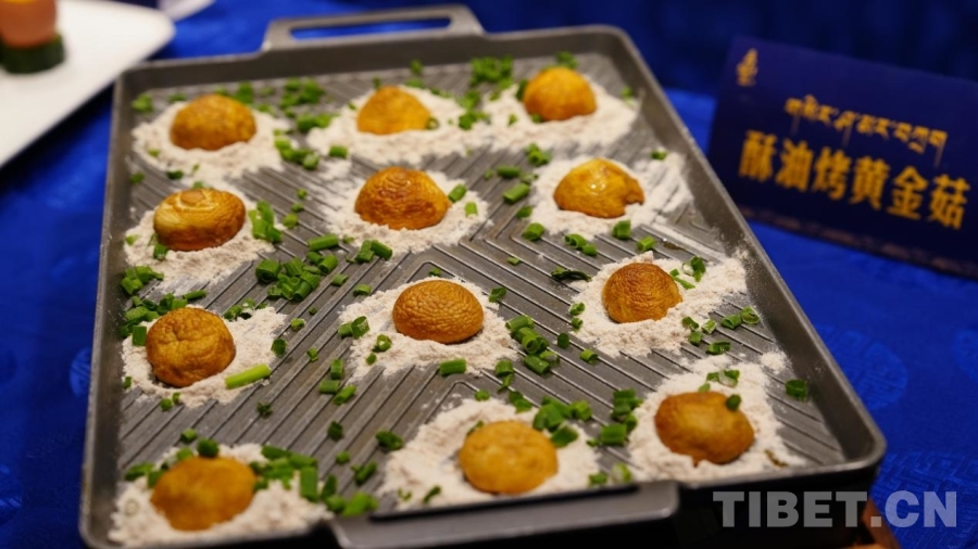 圖為廚房?jī)?nèi)展示的“酥油烤黃金菇”菜品