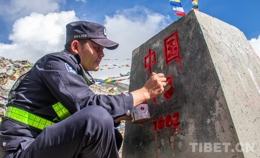 圖為日喀則邊境管理支隊霍爾巴邊境派出所民警為紀念中國人民抗日戰(zhàn)爭暨世界反法西斯戰(zhàn)爭勝利80周年開展界碑描紅 攝影:楊承旭