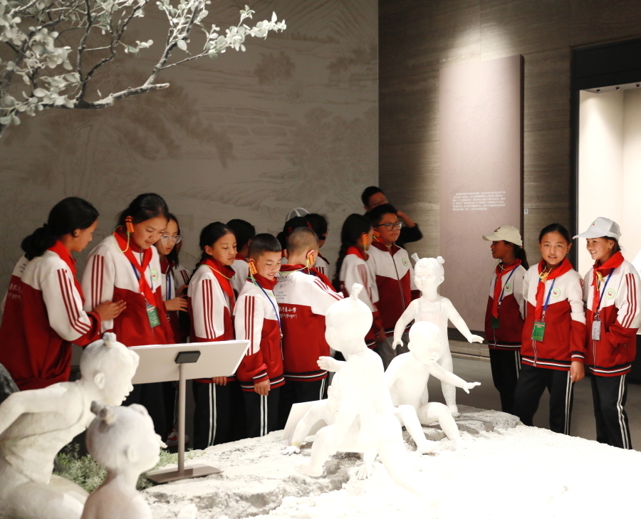 圖為《風乎舞雩》群像塑像前,孩子們體悟千年前對于百姓富足、社會安定的理想追求 攝影:劉莉