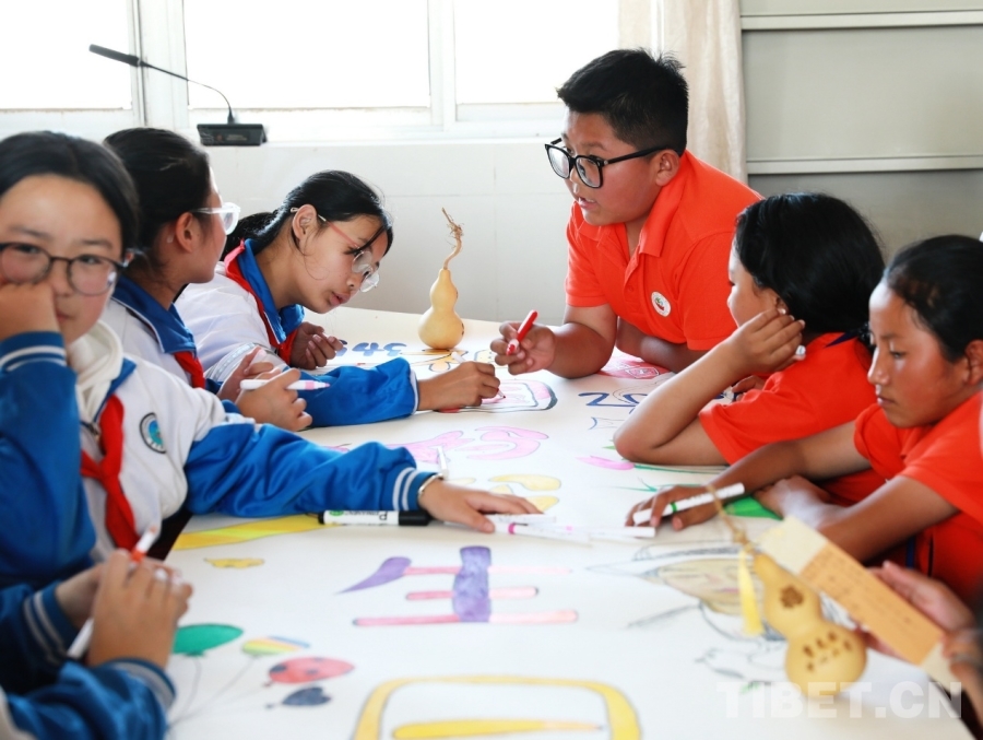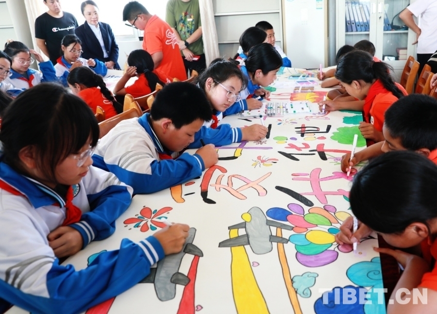 圖為西藏阿里噶爾縣孔繁森小學(xué)、山東聊城堂邑鎮(zhèn)中心小學(xué)的孩子們共同創(chuàng)作迎國(guó)慶主題畫(huà)卷 攝影:劉莉