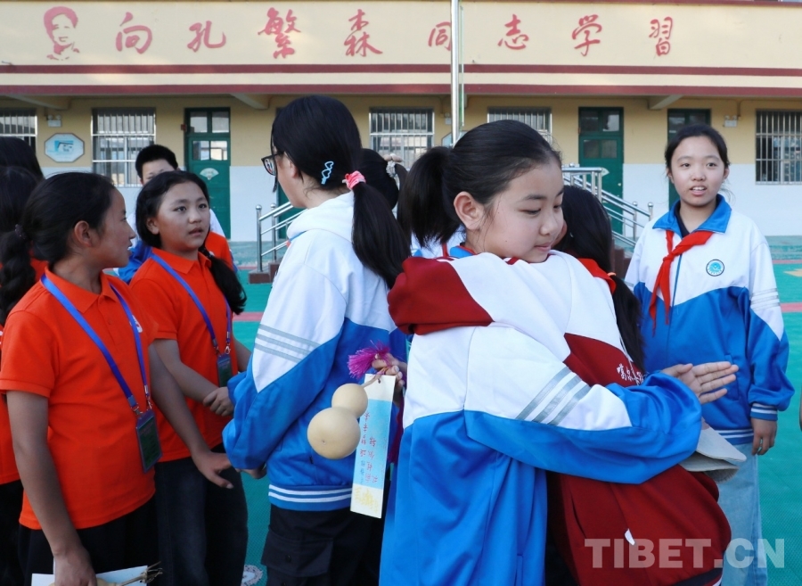 圖為西藏阿里噶爾縣孔繁森小學(xué)的孩子們?cè)谏綎|聊城堂邑鎮(zhèn)中心小學(xué)開(kāi)展聯(lián)誼活動(dòng)即將離開(kāi)時(shí)與山東的小伙伴們依依惜別 攝影:劉莉