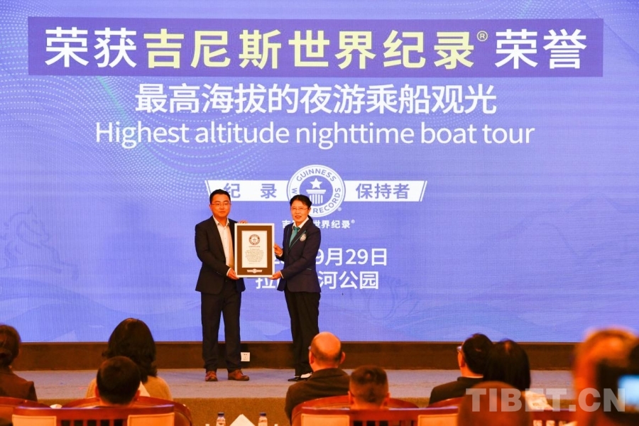 圖為“最高海拔的夜游乘船觀光”吉尼斯世界紀(jì)錄證書(shū)頒發(fā)現(xiàn)場(chǎng) 攝影:趙振宇
