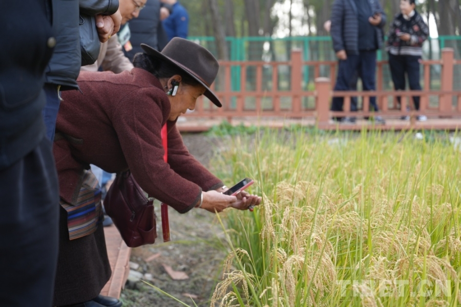 圖為西藏基層干部學習參觀團成員對豐收的稻谷愛不釋手,連連拍攝 攝影:王茜