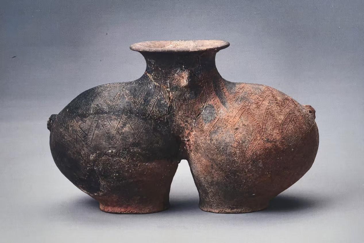 西藏昌都卡若遺址里出土了一只大約距今5000年的陶罐,它造型獨特、紋飾精美、色彩深邃,展現(xiàn)了高原先民極高的彩陶技藝,這便是如今西藏博物館的標識原型——朱墨彩繪雙體陶罐。