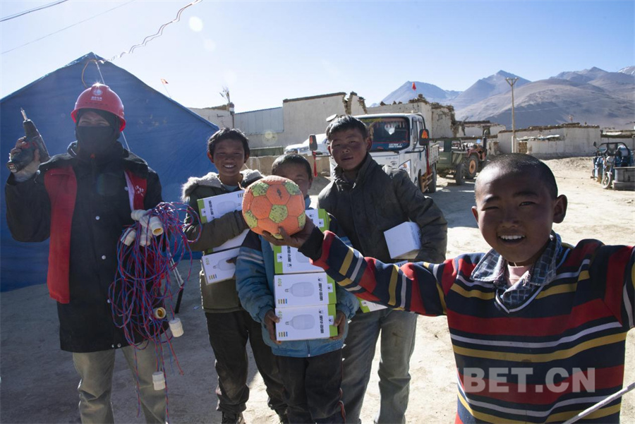 圖為地震發(fā)生第三日,在定日縣曲洛鄉(xiāng)措昂村國家電網(wǎng)工作人員為受災群眾安置點通電,孩子們開心地加入工作人員的隊伍中隨時搭把手(攝于2025年1月9日) 攝影:趙振宇