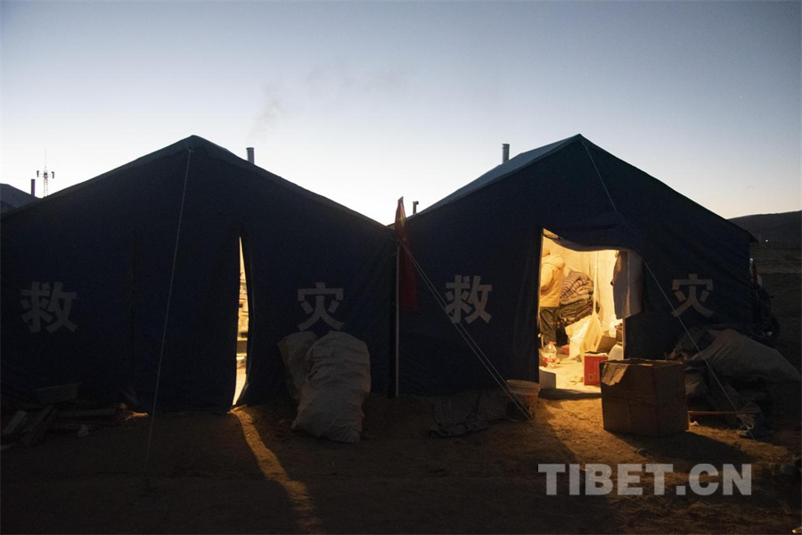 圖為地震發(fā)生第四日,夜幕即將降臨之時定日縣長所鄉(xiāng)雜村受災群眾安置點內(nèi)救災帳篷中泛起暖光(攝于2025年1月10日) 攝影:趙振宇