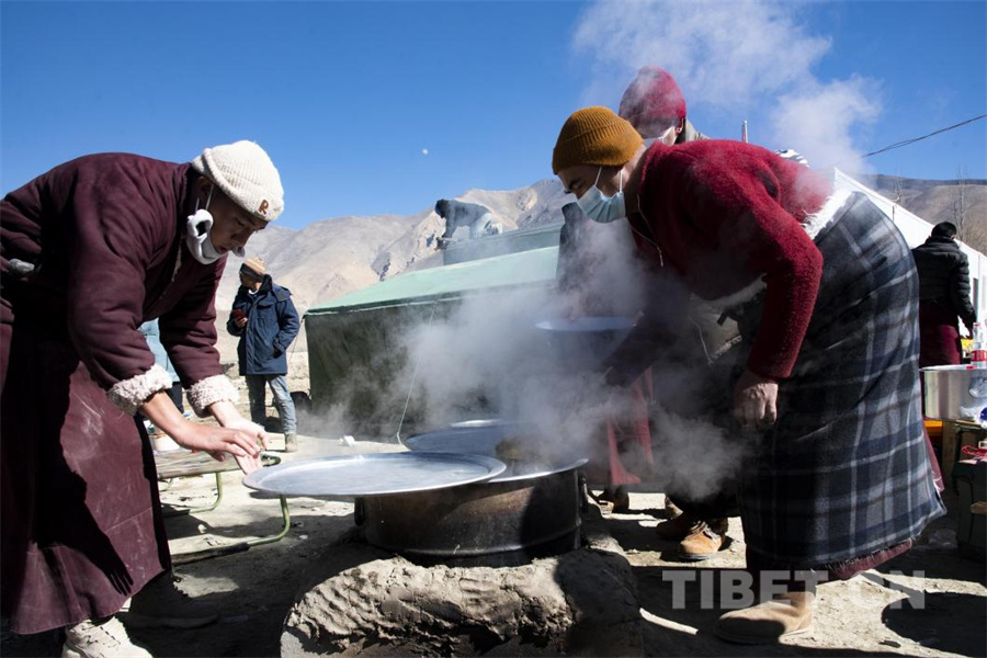 圖為震后第一個藏歷新年古突夜,在定日縣長所鄉(xiāng)茶江村受災群眾安置點里,村民扎西正在盛出熱氣騰騰的“古突”(攝于2025年2月27日) 攝影:趙振宇