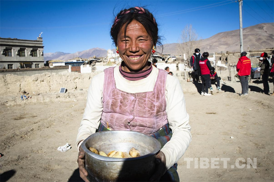 圖為在定日縣受災群眾安置點,受災群眾拿出家中煮熟的最好的土豆給每一位“客人”分發(fā)(攝于2025年1月14日) 攝影:趙振宇