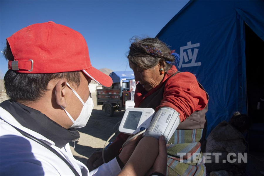 圖為在定日縣受災群眾安置點,作為第一支挺進災區(qū)的民間醫(yī)療力量,西藏阜康醫(yī)院的醫(yī)生正在為受災群眾檢查身體(攝于2025年1月14日)攝影:趙振宇