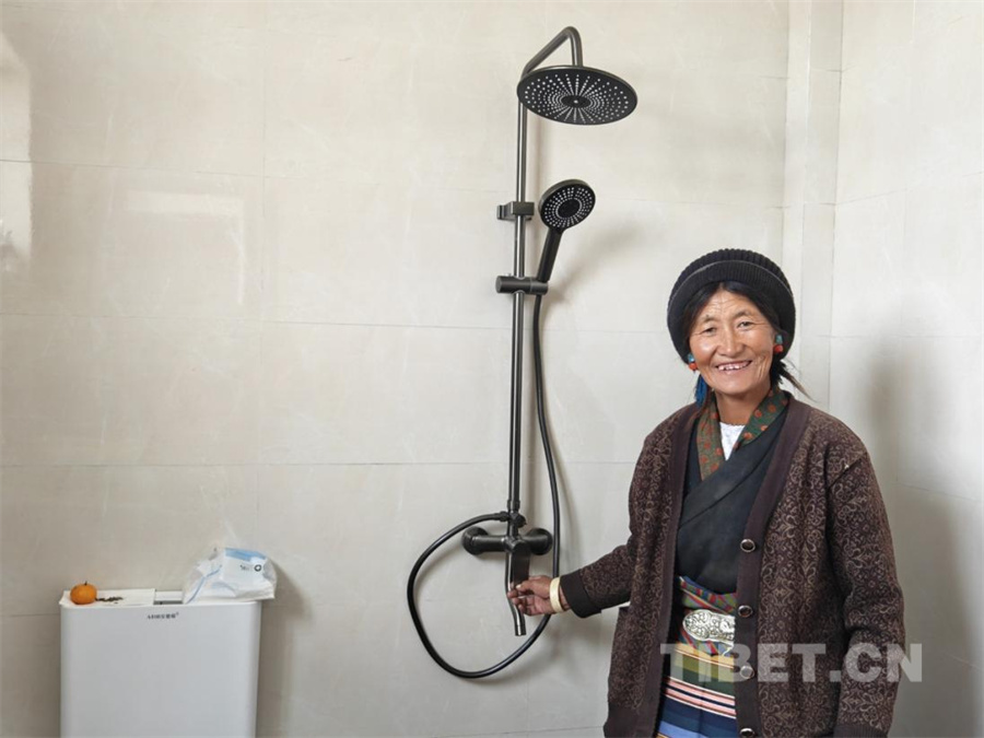 圖為日喀則市拉孜縣拉孜鎮(zhèn)措布村村民向記者展示自家新居內(nèi)的淋浴設(shè)施,臉上洋溢著幸福的笑容(攝于2025年10月30日) 攝影:次旦拉姆