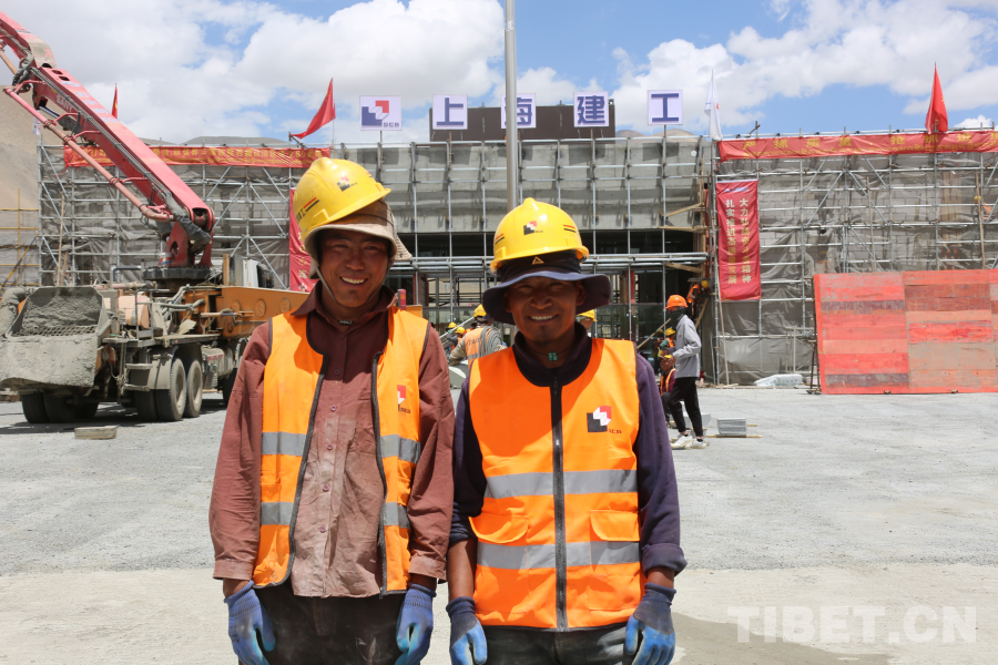 圖為森嘎村災后重建現(xiàn)場,森嘎村村民米瑪(左)和頓珠(右)參與以工代賑項目,用自己的雙手建設(shè)家園(攝于2025年6月15日)攝影:旦曲