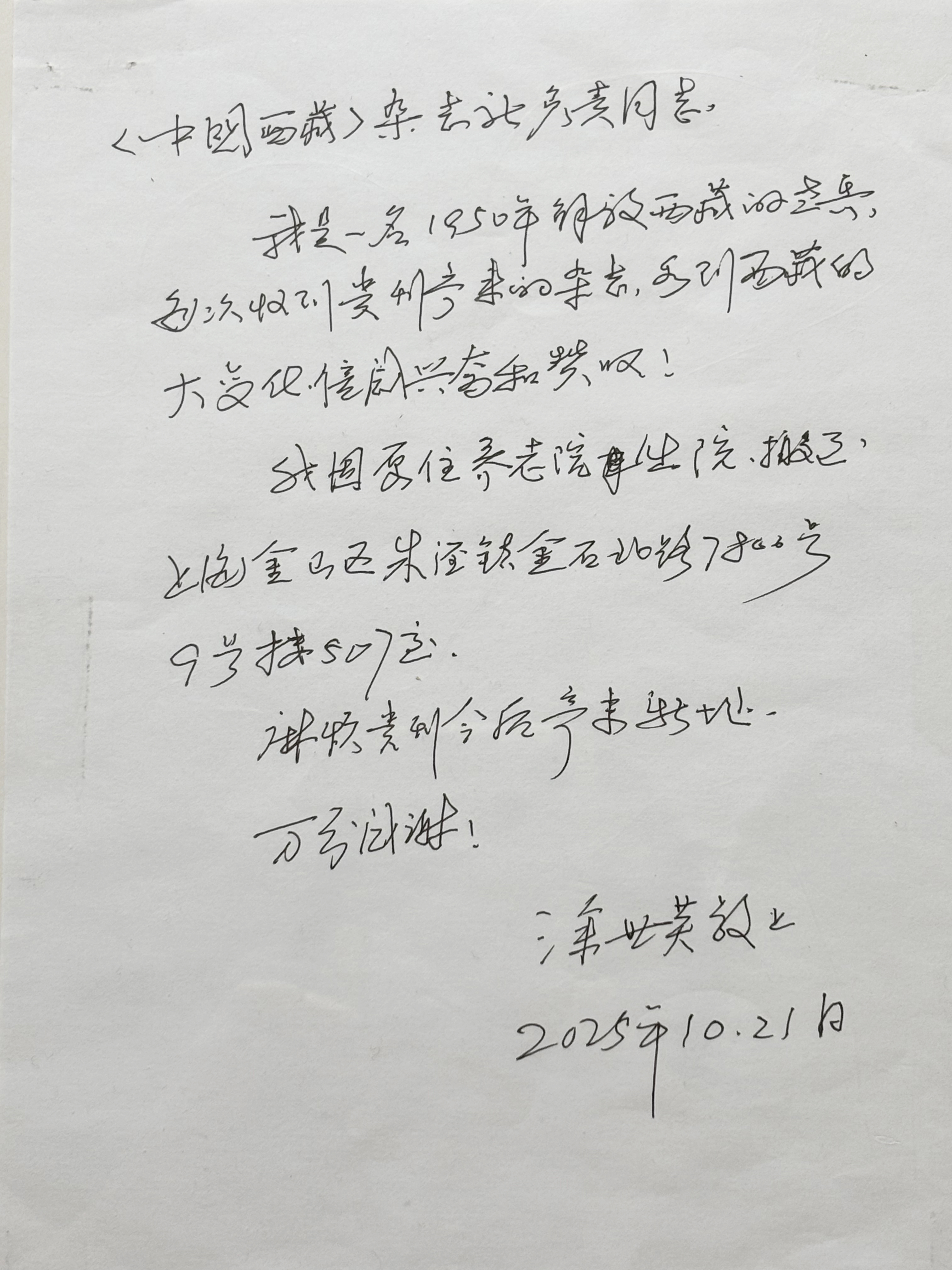 涂世英老先生,見字如面。您的來信,《中國西藏》雜志編輯部已完整收悉,心中滿是敬意與溫暖。我們深知,您是1950年便投身于解放西藏偉大事業(yè)的老兵,是雪域高原和平解放的親歷者、見證者,是用青春與熱血守護這片土地的先行者。歲月流轉(zhuǎn),您始終未曾放下對西藏的牽掛,每一次收到本刊,都為這片高原翻天覆地的變化感到由衷興奮和贊嘆。這份跨越時光的關(guān)注,讓我們每一位編輯都深受觸動。