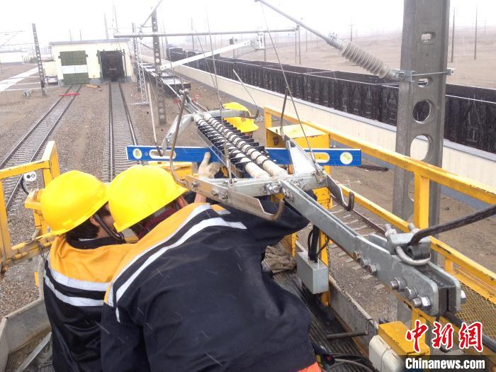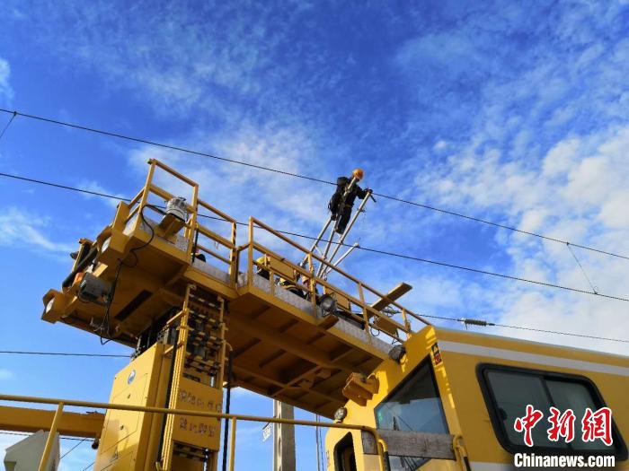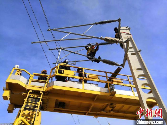 圖為中國(guó)鐵路青藏集團(tuán)有限公司西寧供電段格爾木接觸網(wǎng)大修工區(qū)的接觸網(wǎng)工進(jìn)行檢修作業(yè)。周賀 攝