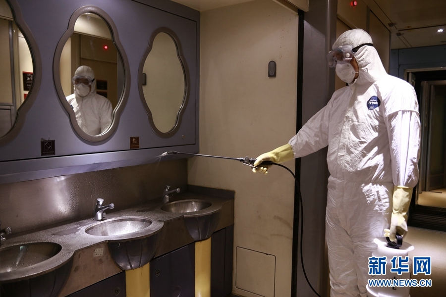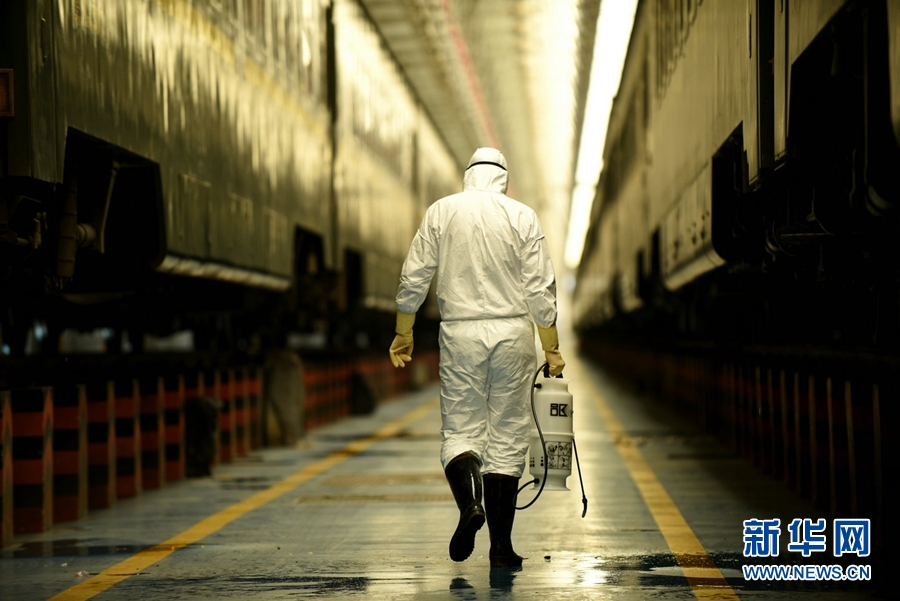 工作人員對每一列旅客列車進行消毒作業(yè)。新華網 郝寶君 攝