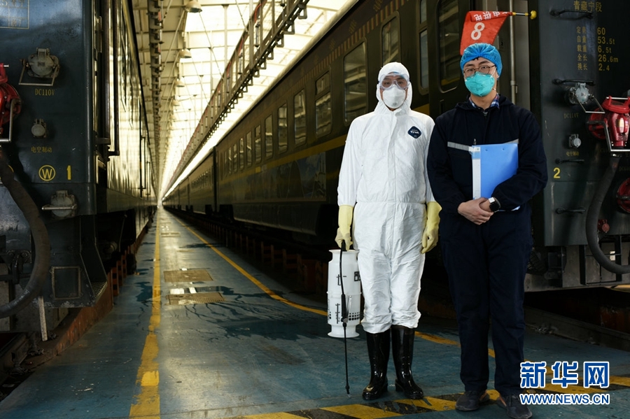 在西寧車輛段車庫內,鐵路防疫人員對每一輛旅客列車進行全面消殺作業(yè)。新華網 李俊 攝