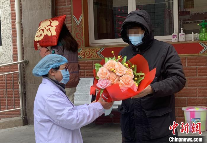 醫(yī)護(hù)人員向走出隔離病區(qū)的降某送上鮮花?!⒅铱?攝