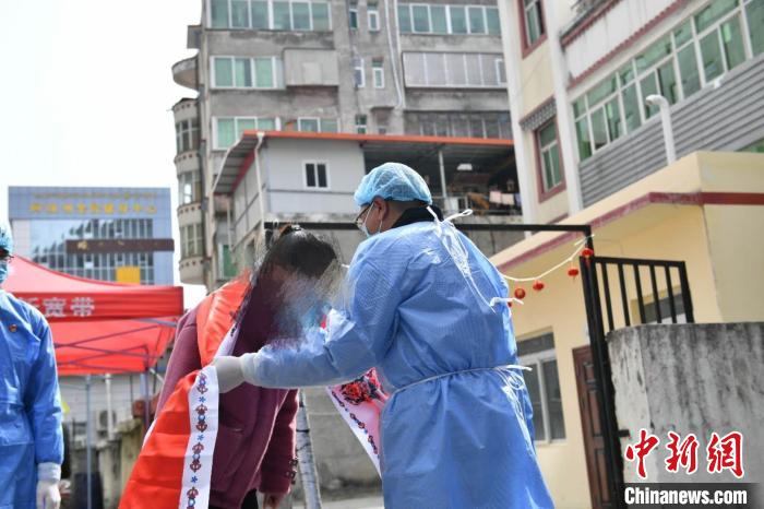 醫(yī)護(hù)人員向郭某某送上鮮花?!≈芡?攝