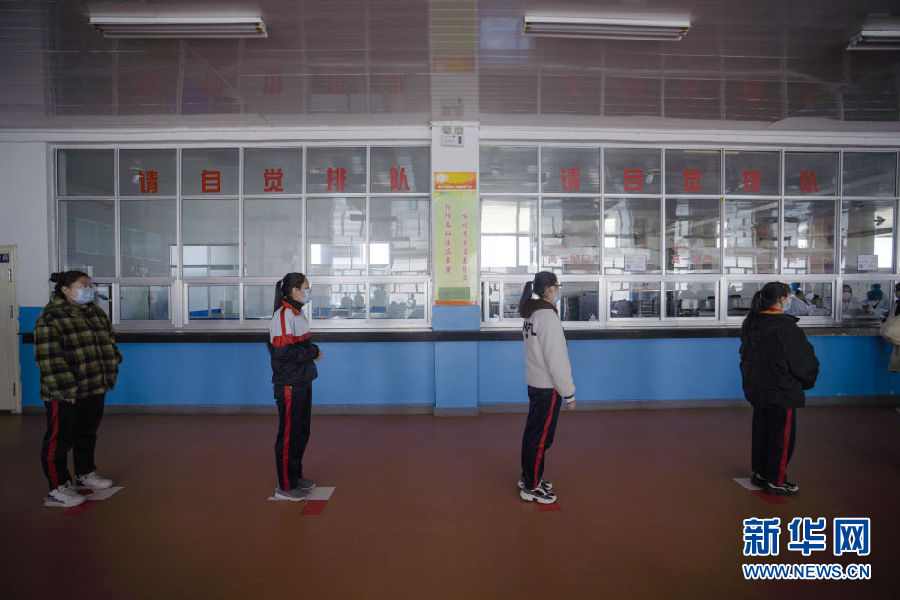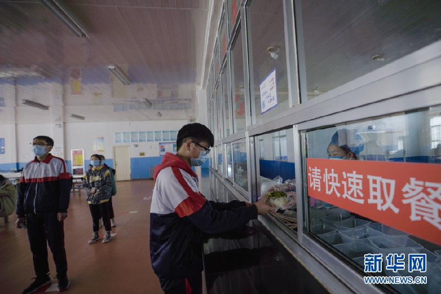 3月14日,海北州第一高級中學(xué)學(xué)生正在餐廳排隊取餐。新華社 吳剛 攝