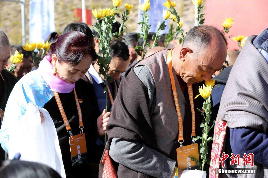 圖為民眾手捧哈達(dá)和鮮花緬懷犧牲英烈及罹難同胞。中新社記者 張?zhí)砀?攝