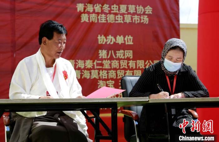 圖為企業(yè)家與供貨商在現(xiàn)場簽定供銷合同。青海省冬蟲夏草協(xié)會供圖