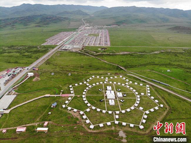 尕秀村的帳篷城由108頂大小各異的藏式風(fēng)格帳篷組成??罩懈╊豁旐攷づ袢缤活w顆璀璨的珍珠,點(diǎn)綴著曬銀灘草原的秀美。楊艷敏 攝