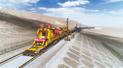 為了如期推進項目建設,目前,格庫鐵路(新疆段)施工人員正以每天鋪軌1.5公里的速度向前推進,預計7月份將完成格庫鐵路(新疆段)全線鋪軌施工任務,10月份具備全線開通條件。