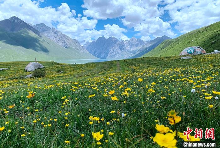 盛夏的年保玉則遍地開著金黃色的格?;ǎh處的湖水、雪山與藍天白云相互交映,宛如一幅油彩畫。肉公和他的隊友們手拿編織袋和長長的夾鉗按點進行巡護。