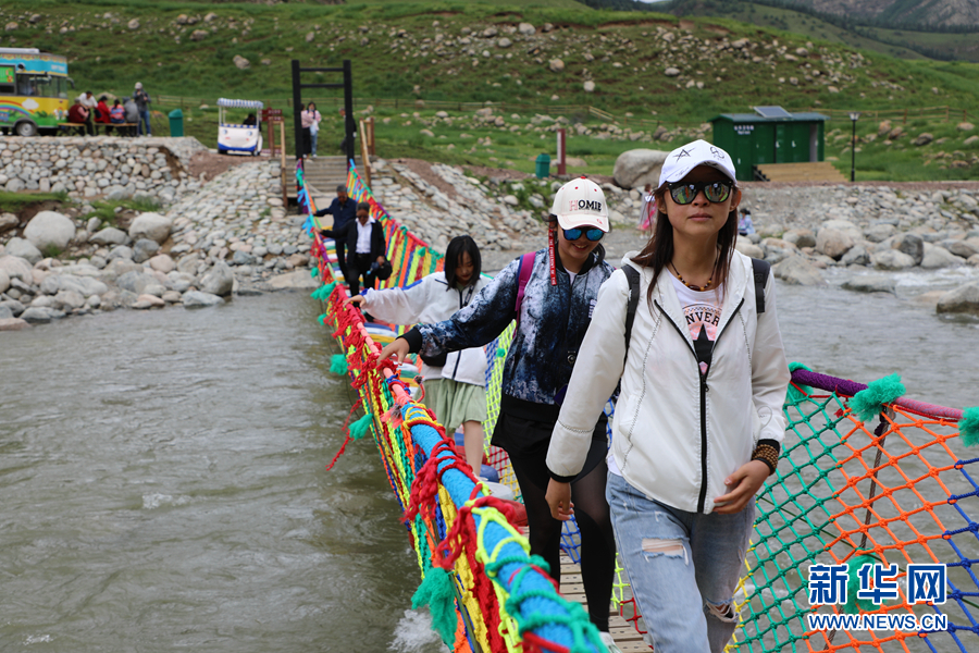 援鄂醫(yī)療隊員和家屬走過冰溝河景區(qū)“彩虹橋”。新華網(wǎng) 童張偉 攝