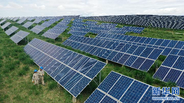 7月8日,在青海省海南藏族自治州共和縣,大唐青海公司新能源分公司兩名工作人員在光伏電站內(nèi)巡檢(無人機照片)。新華社記者 張宏祥 攝
