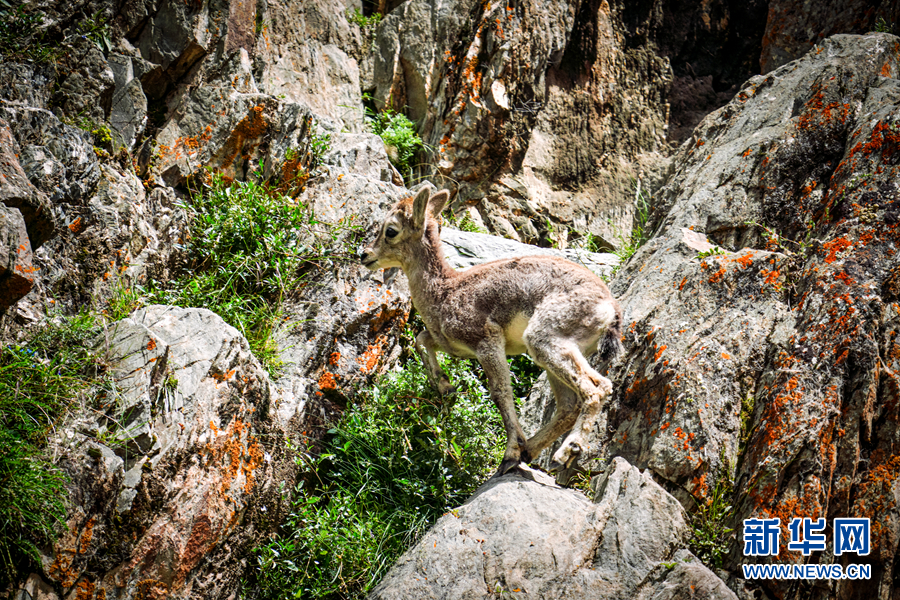 一只小巖羊在巖壁上嬉戲。新華網(wǎng) 宋忠勇 攝