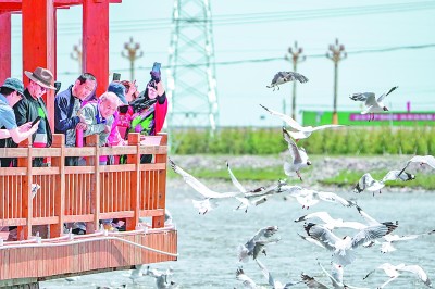 在青海省海北藏族自治州剛察縣的沙柳河湟魚(yú)家園,水鳥(niǎo)翔集,引來(lái)眾多游人駐足。徐譚 攝
