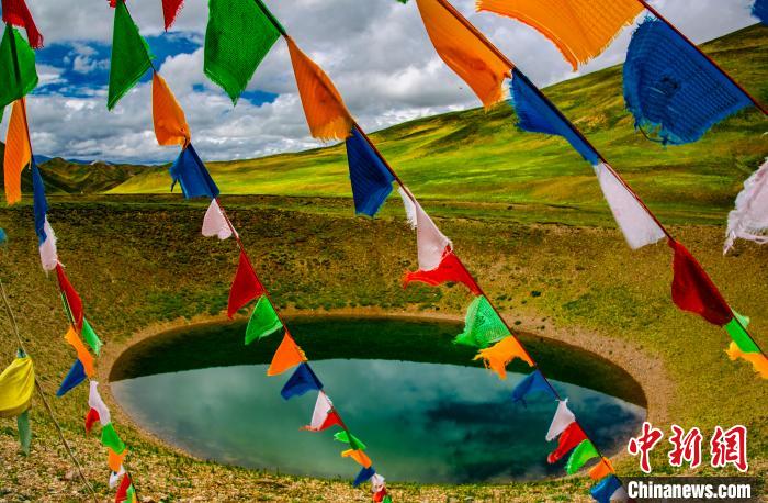 圖為經(jīng)幡下的碧綠湖水。功霸扎西達杰 攝
