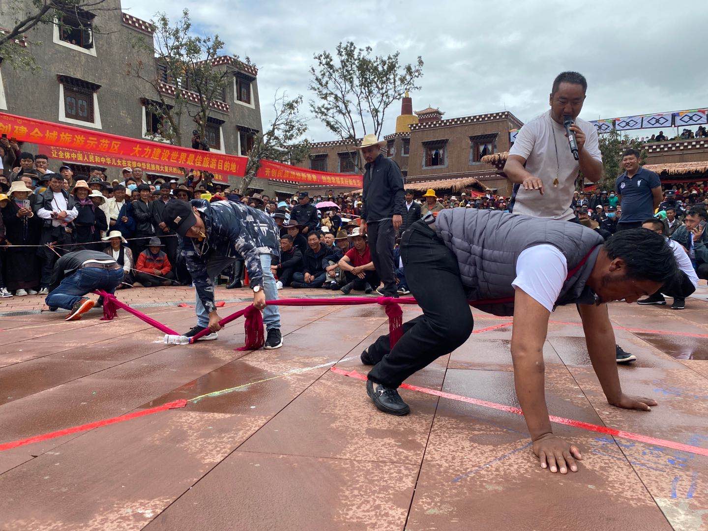 現(xiàn)場(chǎng)兩名運(yùn)動(dòng)員俯下身去,脖子上套上同一根長(zhǎng)綢布帶,正在做著賽前的準(zhǔn)備工作?!皢簟币宦暽陧戇^后,雙方運(yùn)動(dòng)員四肢著地,往相反的方向奮力爬行,布帶隨之被拉直繃緊,賽場(chǎng)氣氛也隨即變得緊張……這種趴著拔河的體育項(xiàng)目叫做格吞,也叫“藏式拔河”。