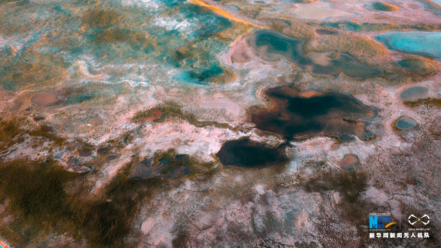 天空中的晚霞與地上的湖泊形成了獨(dú)特的美景。(航拍圖)新華網(wǎng) 宋忠勇 攝