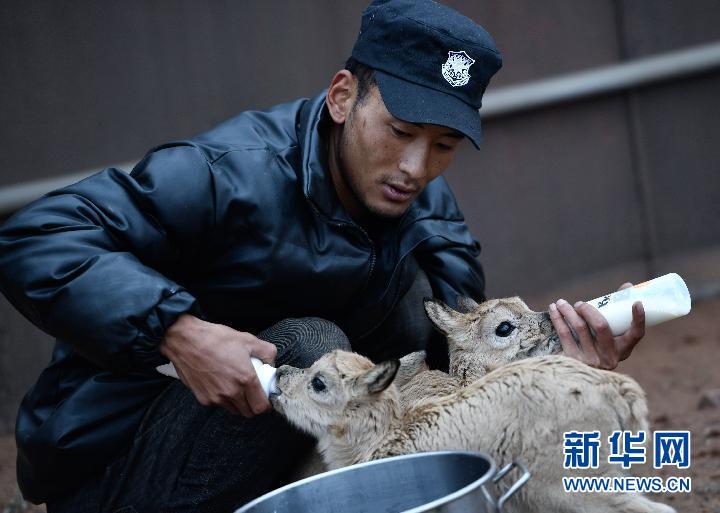 7月8日,三江源國家公園管理局長江源園區(qū)可可西里管理處卓乃湖保護(hù)站的工作人員才文多杰在給藏羚羊幼仔喂奶。新華社記者 張龍 攝