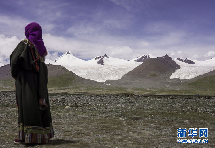 8月15日,牧民在雪山腳下遠眺崗加曲巴冰川。新華社記者 吳剛 攝